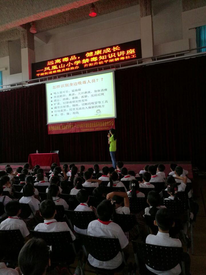 为加强学生对毒品危害的认识,增强自我保护意识,营造良好的成长环境,深圳市升阳升社会工作服务社驻平湖街道禁毒社工于2016年10月24日下午15时在凤凰山小学为该校四、五、六年级约600名学生开展了一次“远离毒品,健康成长”为主题的校园禁毒宣传活动。