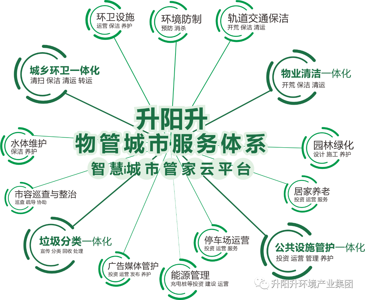 公司服务内容以城乡环卫一体化为载体,涵盖从环卫清扫、物业保洁、垃圾分类、园林绿化、环境防治、公厕管养、市容巡查与整治、水体维护,到公共安全管理、市政设施管护、广告媒体管护、停车服务、能源管理、社工服务、居家养老服务等城市管家服务,逐步形成升阳升物管城市综合服务体系。