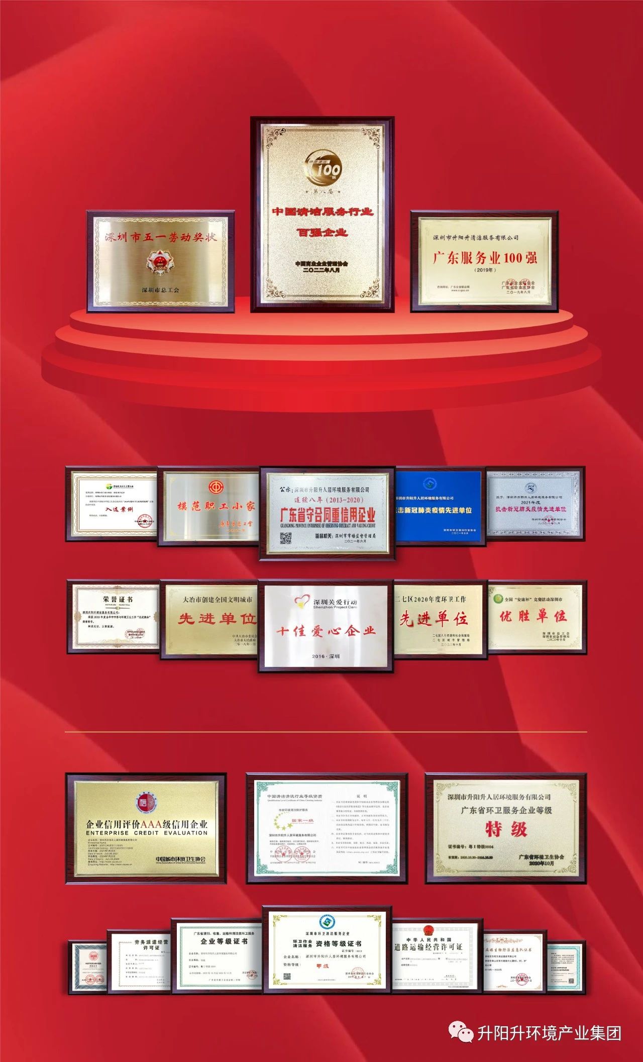 升阳升具有中国清洁清洗行业国家一级资质、中国城市环境卫生协会首批企业信用AAA 级资质、广东省环卫服务企业特级资质、公共设施维护能力评价甲级资质等 50 多项专业资格证书。