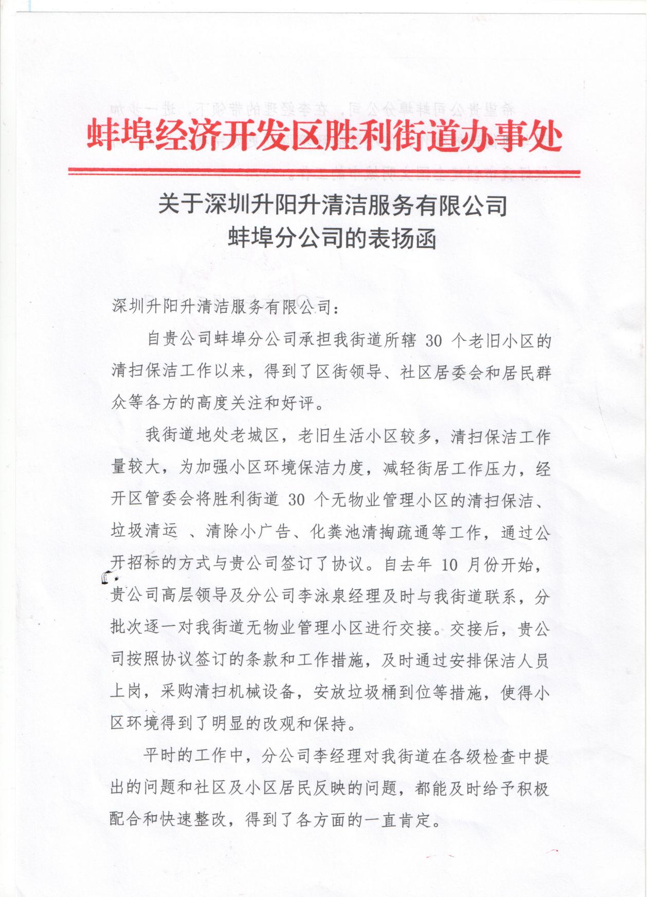 二、蚌埠市经济开发区龙湖街道办事处和胜利街道办事处对蚌埠项目近半年的工作给予了工作主动、管理规范、措施到位、态度认真的高度评价,赢得了区街道领导和居民群众的一致好评。