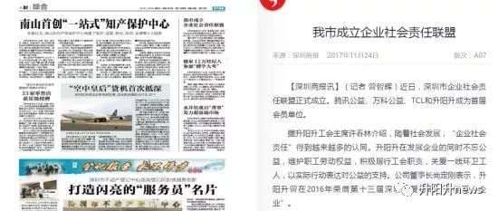 2017年11月23日,中国日报以深圳市企业社会责任联盟成立,升阳升助力深圳建设“爱心之城”为主题进行了传播,《深圳商报》,财经网、腾讯等十多个中央门户网站,南方日报、南方网、深圳热线等区域新闻媒体给予了高度的关注。