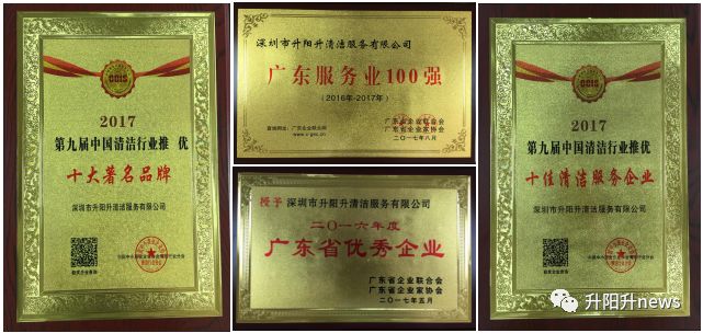2017年获得了第九届中国清洁行业“十大著名品牌”、“十佳清洁服务企业”、2017年度“广东服务业100强”及“广东省优秀企业”等殊荣。在成都、株洲、明光等城市创建“全国文明城市”、“全国卫生城市”的专项活动中,升阳升人更是以自己的实际行动赢得了当地政府和群众的高度赞扬。