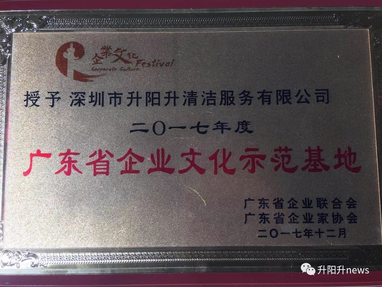 为深入贯彻党的十九大会议精神,积极贯彻新时代中国特色社会主义思想重要指导思想,坚定文化自信,推动广东省企业文化创新发展,展现企业精神风貌。2017年12月,由广东省企业联合会和广东省企业家协会联合对广东省企业文化建设作出突出贡献的单位和企业文化示范基地进行了表彰。深圳市升阳升清洁服务有限公司凭借其自身实力在本次表彰中荣获由广东省企业联合会、广东省企业家协会联合颁发的“2017年度广东省企业文化示范基地”。