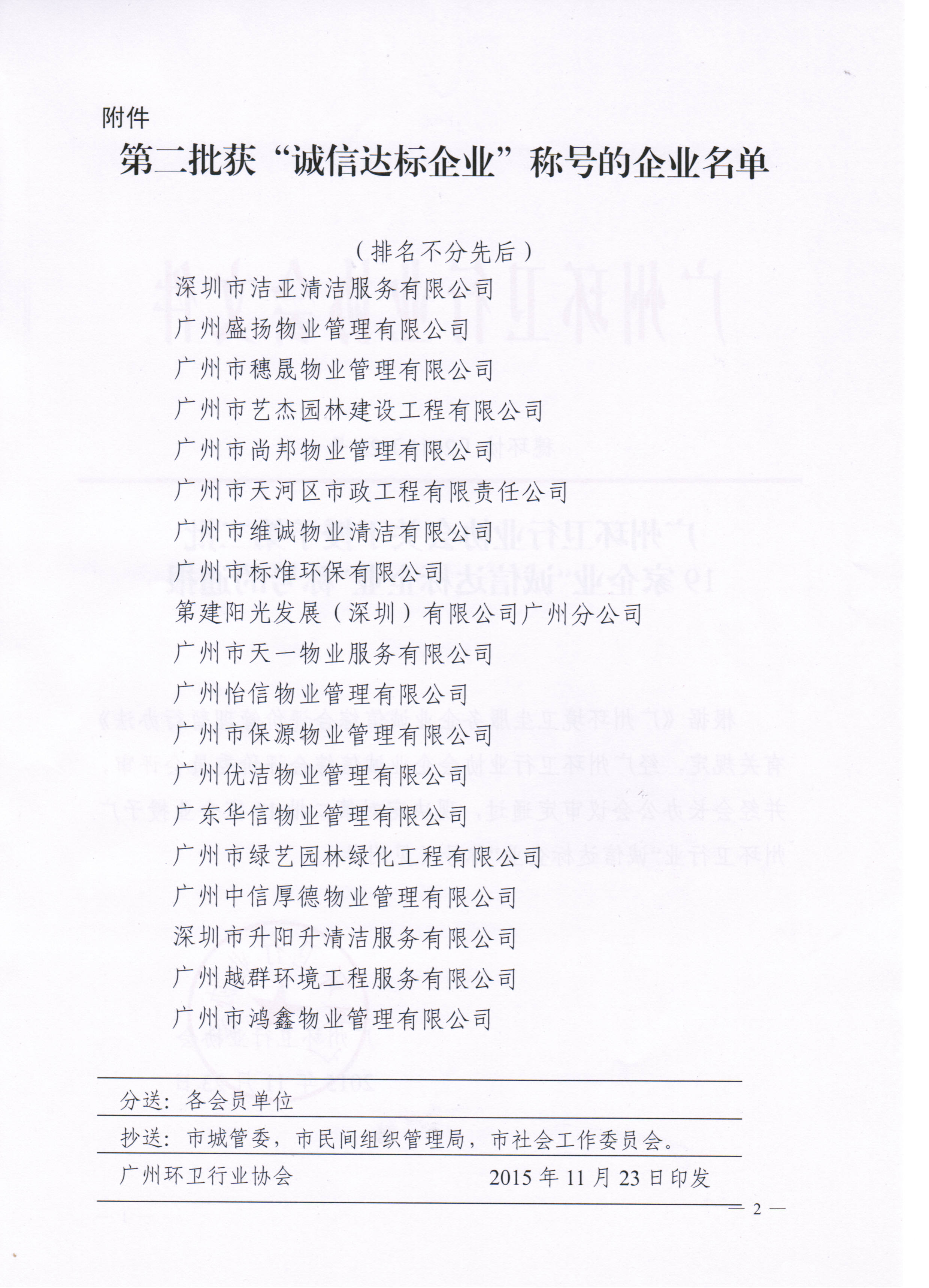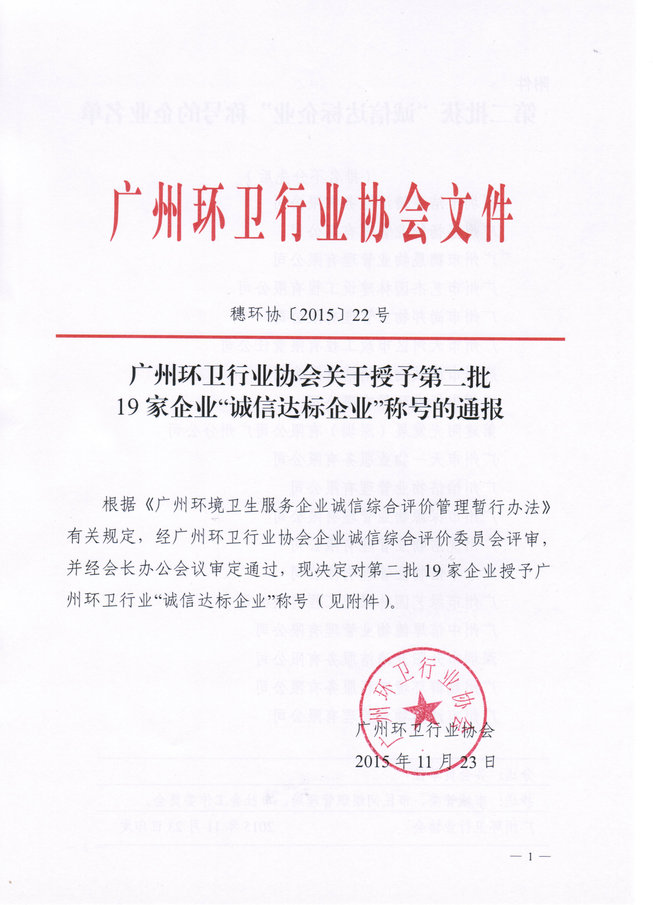 为继续强化行业诚信建设,进一步健全诚信制度和体系建设,强化诚信管理,倡导诚信文化,营造诚信环境,广州环卫行业协会在今年开展了第二批环卫服务企业诚信综合评价评审工作。11月,经“评委会”专家严格评审,有19家参评单位被评为第二批“诚信达标企业”。环卫协会强调,今后要以企业为主体,建立和完善包括诚信信息系统、信用评价体系、诚信激励和失信惩罚机制在内的行业诚信体系,要充分发挥“诚信达标企业”在信用建设中的表率作用,树立诚信的形象,建设“诚信行业”和“诚信企业”。